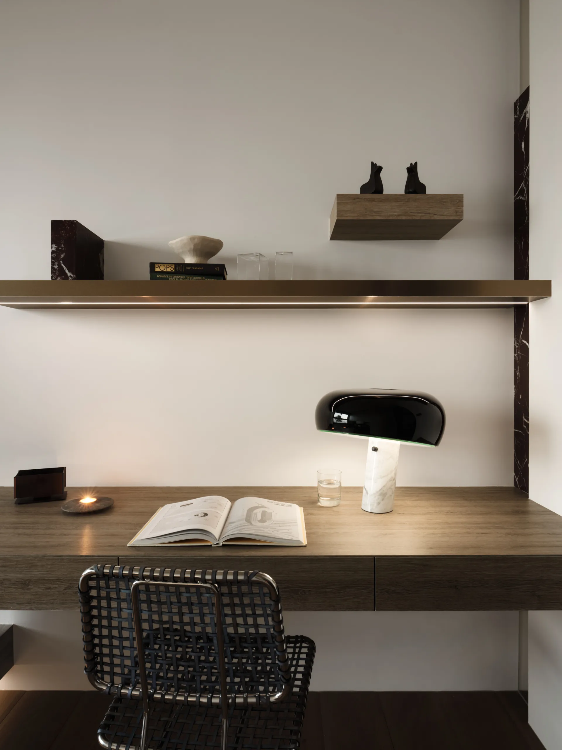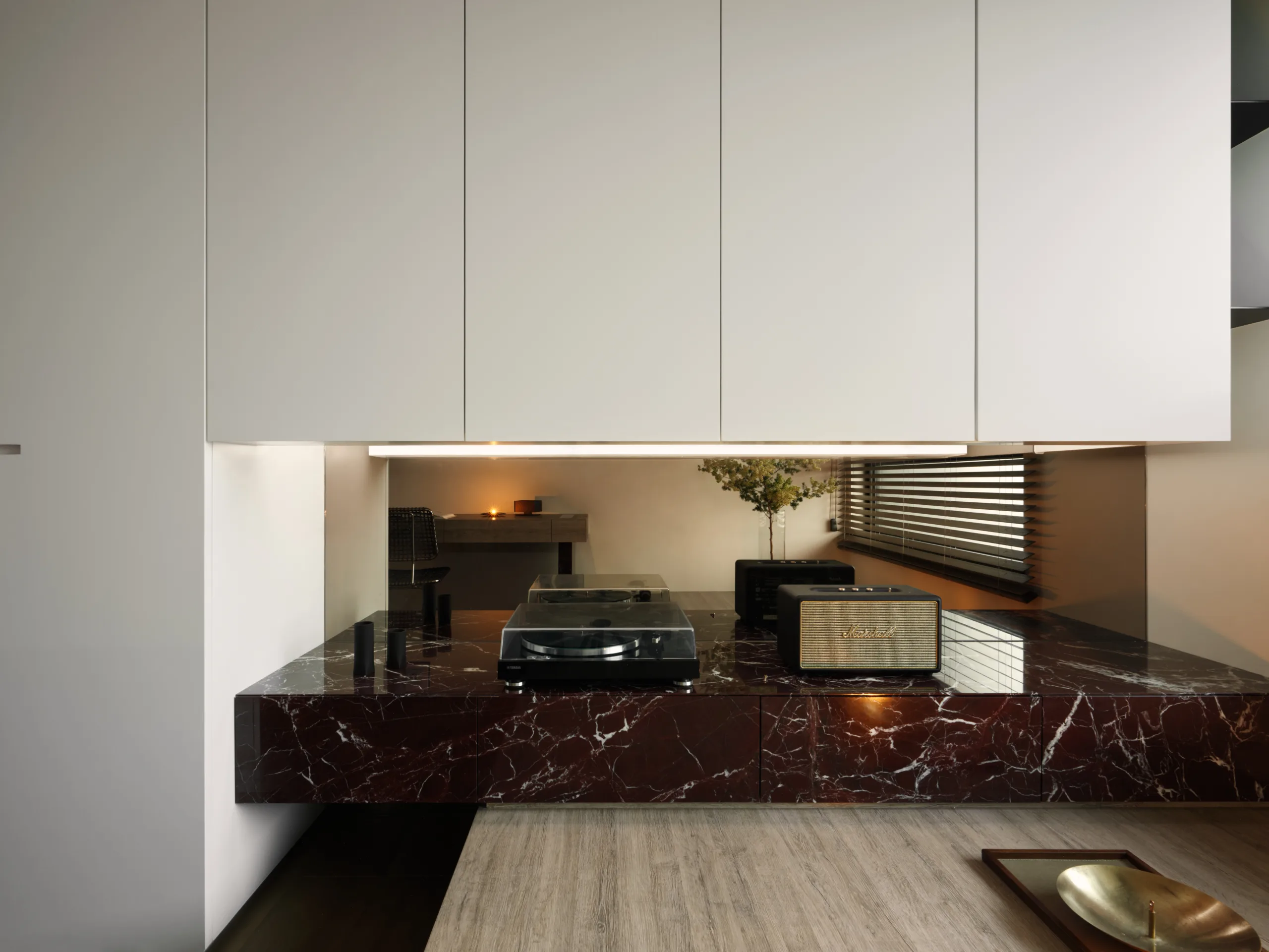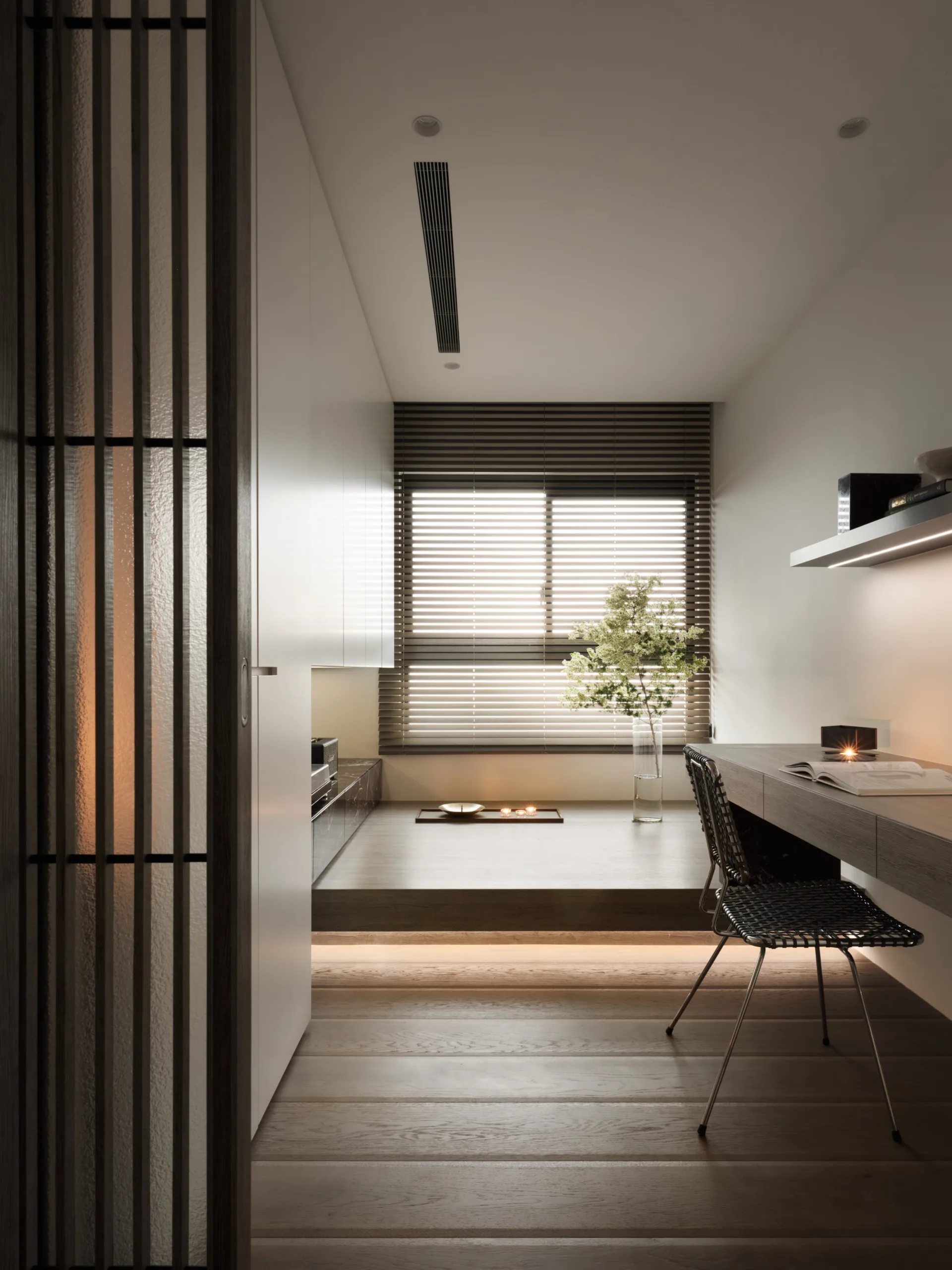一抹櫻桃紅石材如詩意筆鋒,於素淨基調中映現視覺張力。書房高起平台兼具展示與休憩,增添彈性機能。