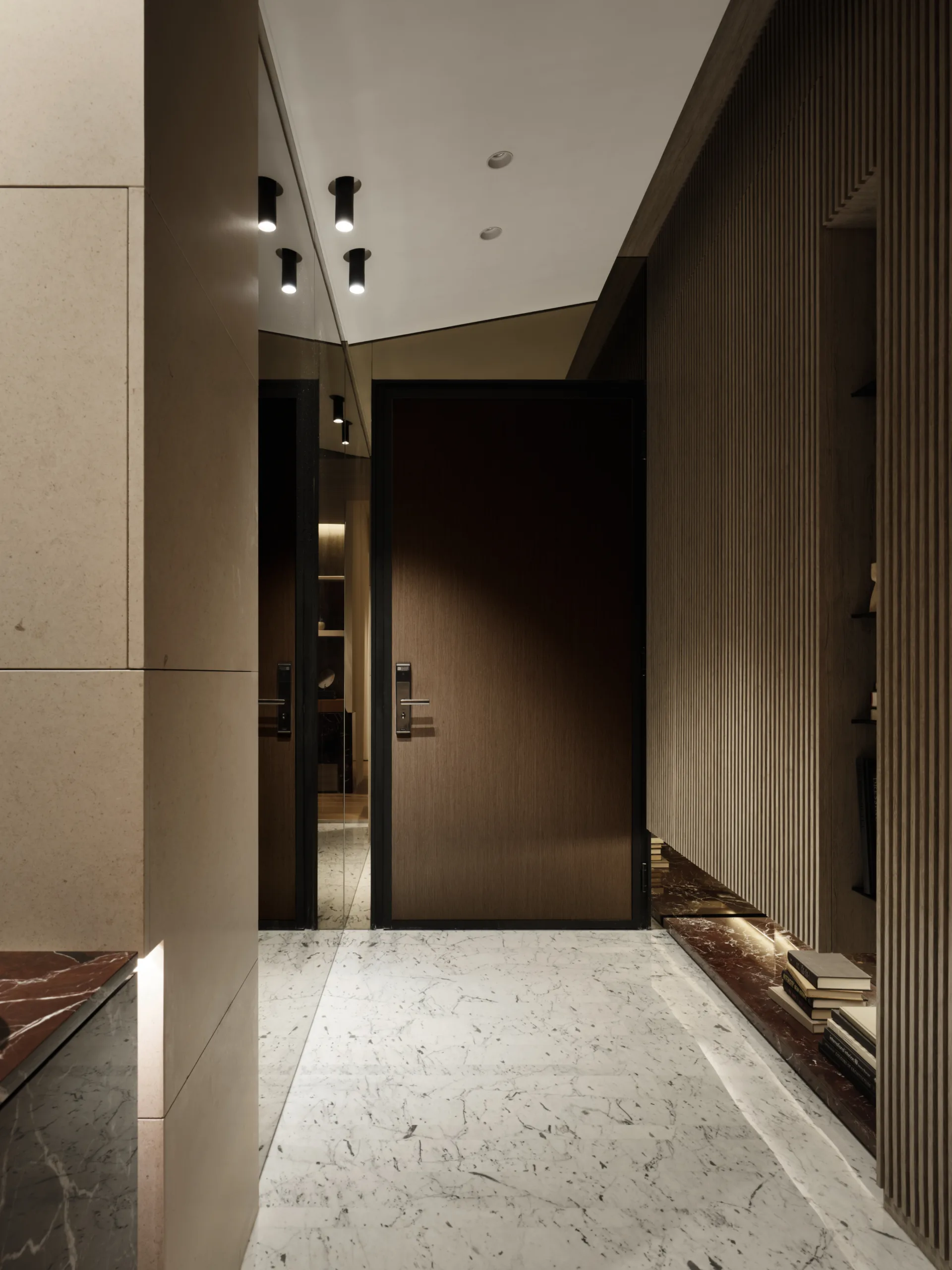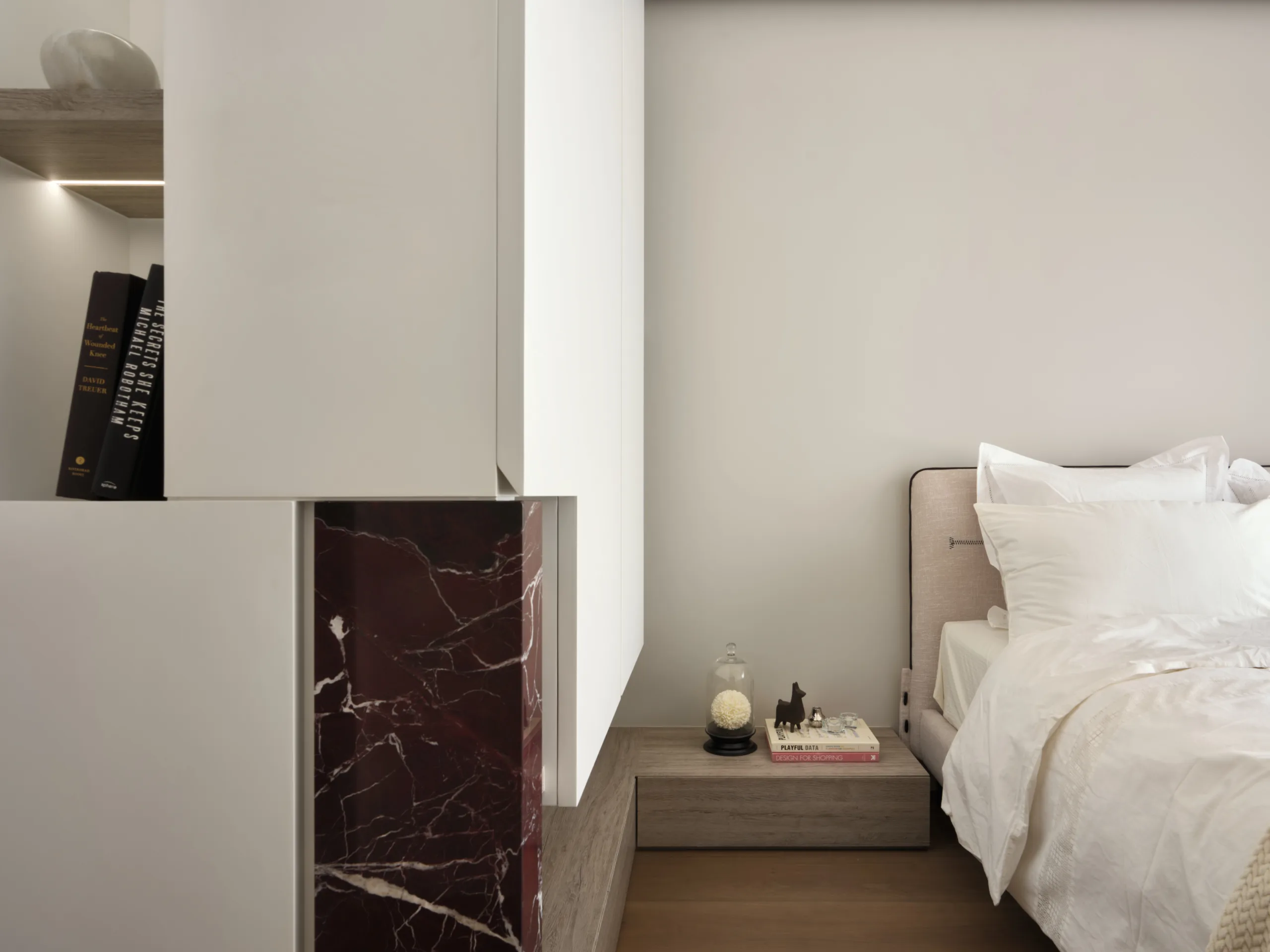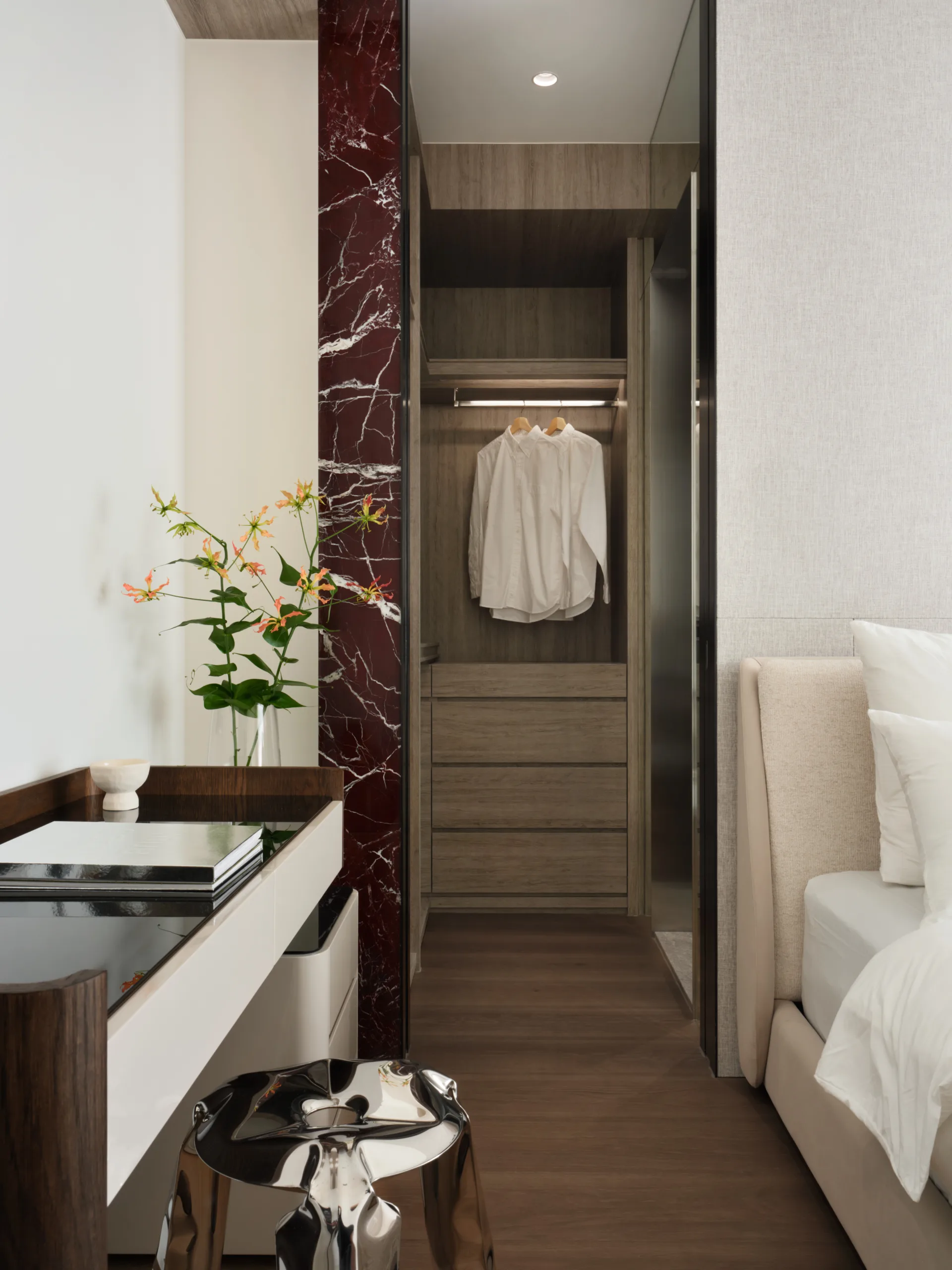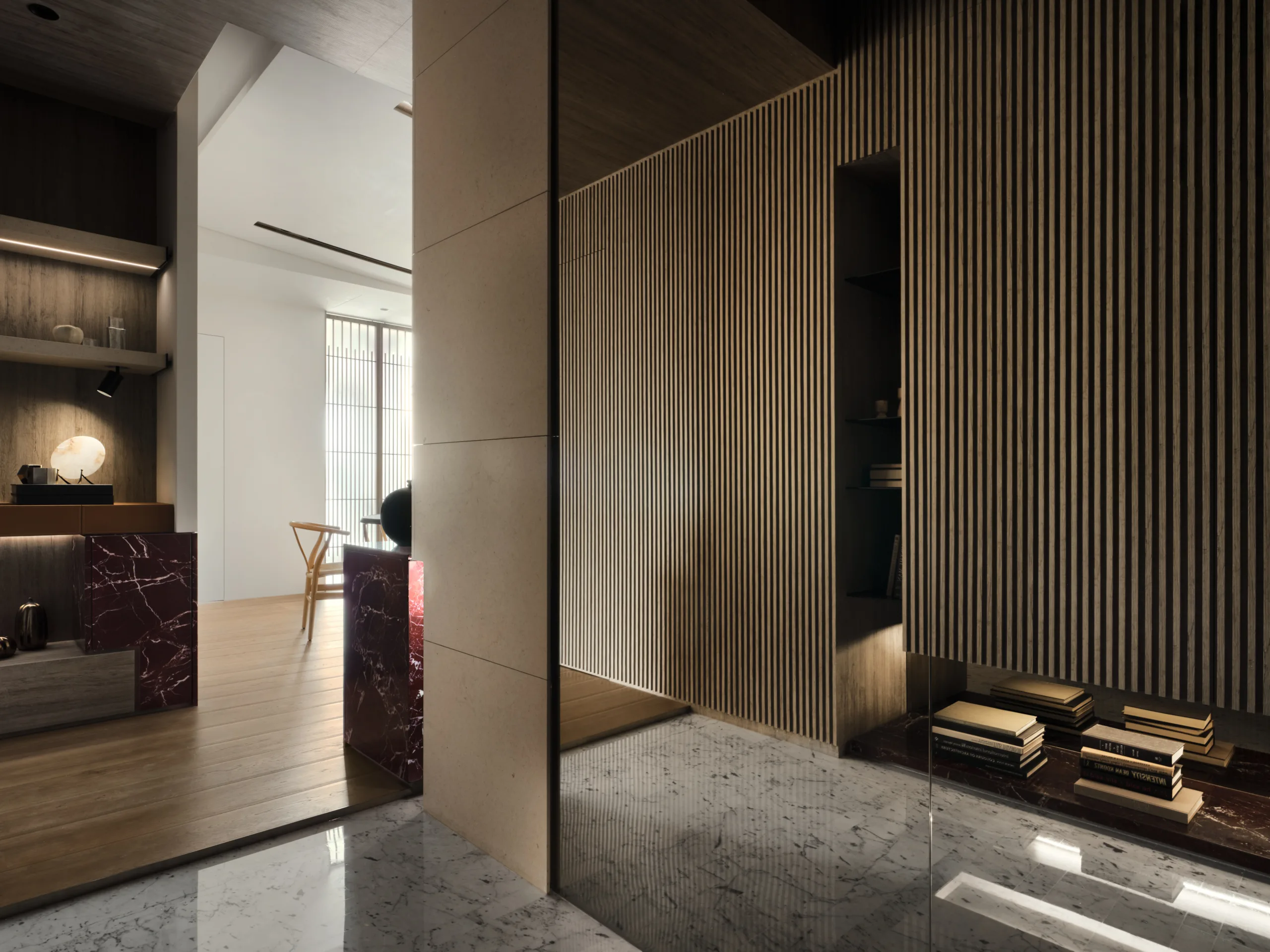 一抹櫻桃紅石材如詩意筆鋒,於素淨基調中映現視覺張力。書房高起平台兼具展示與休憩,增添彈性機能。