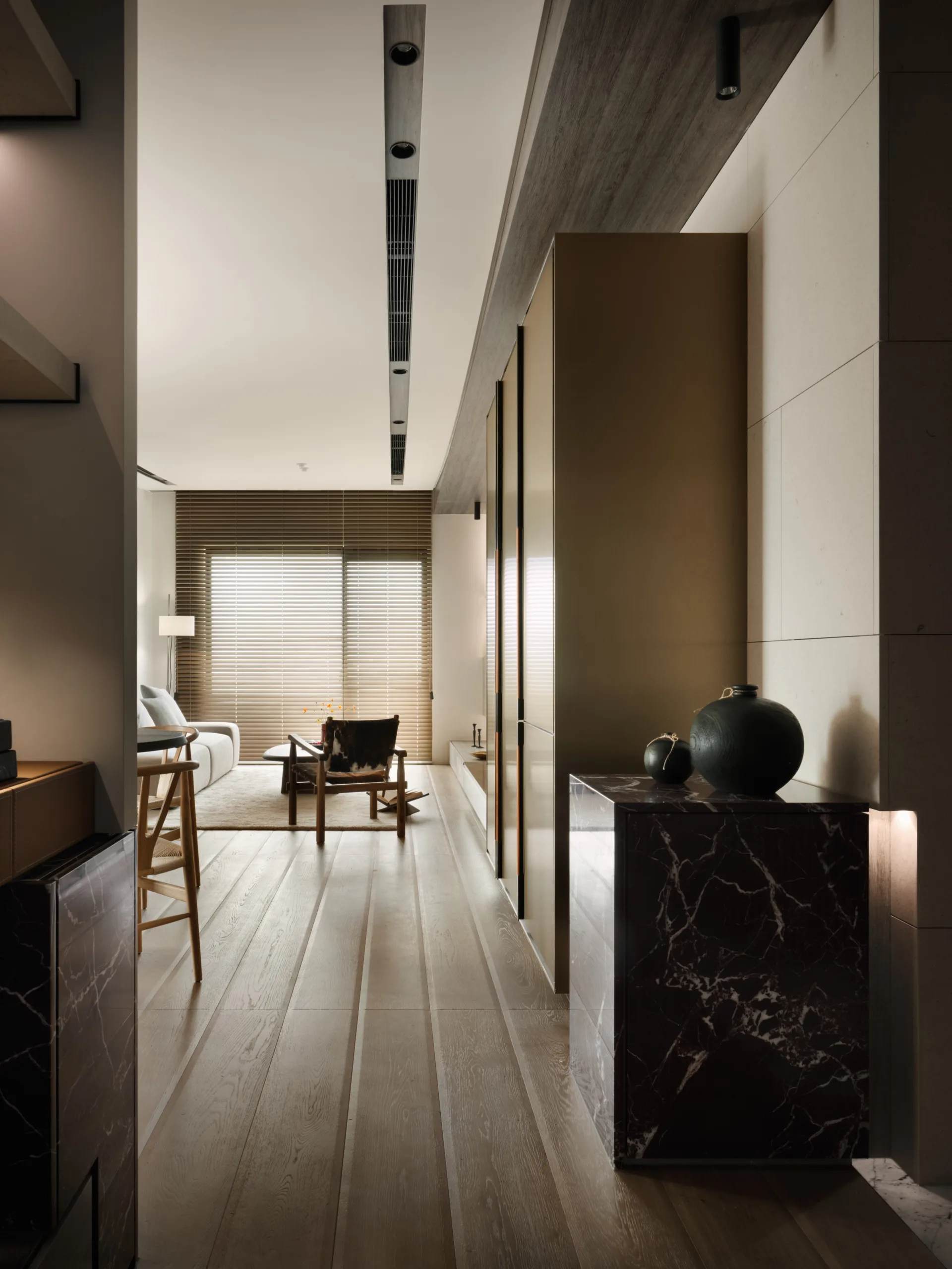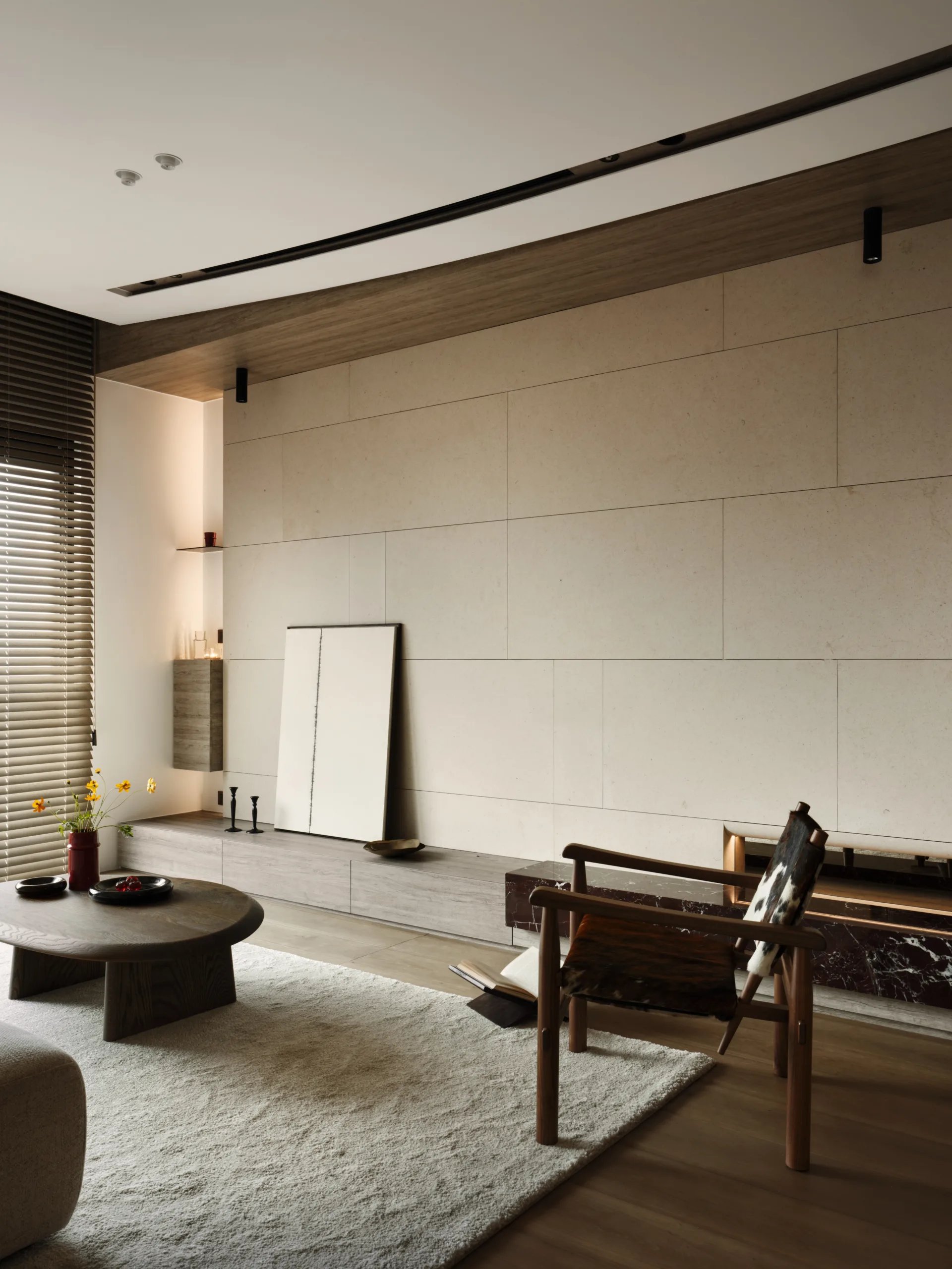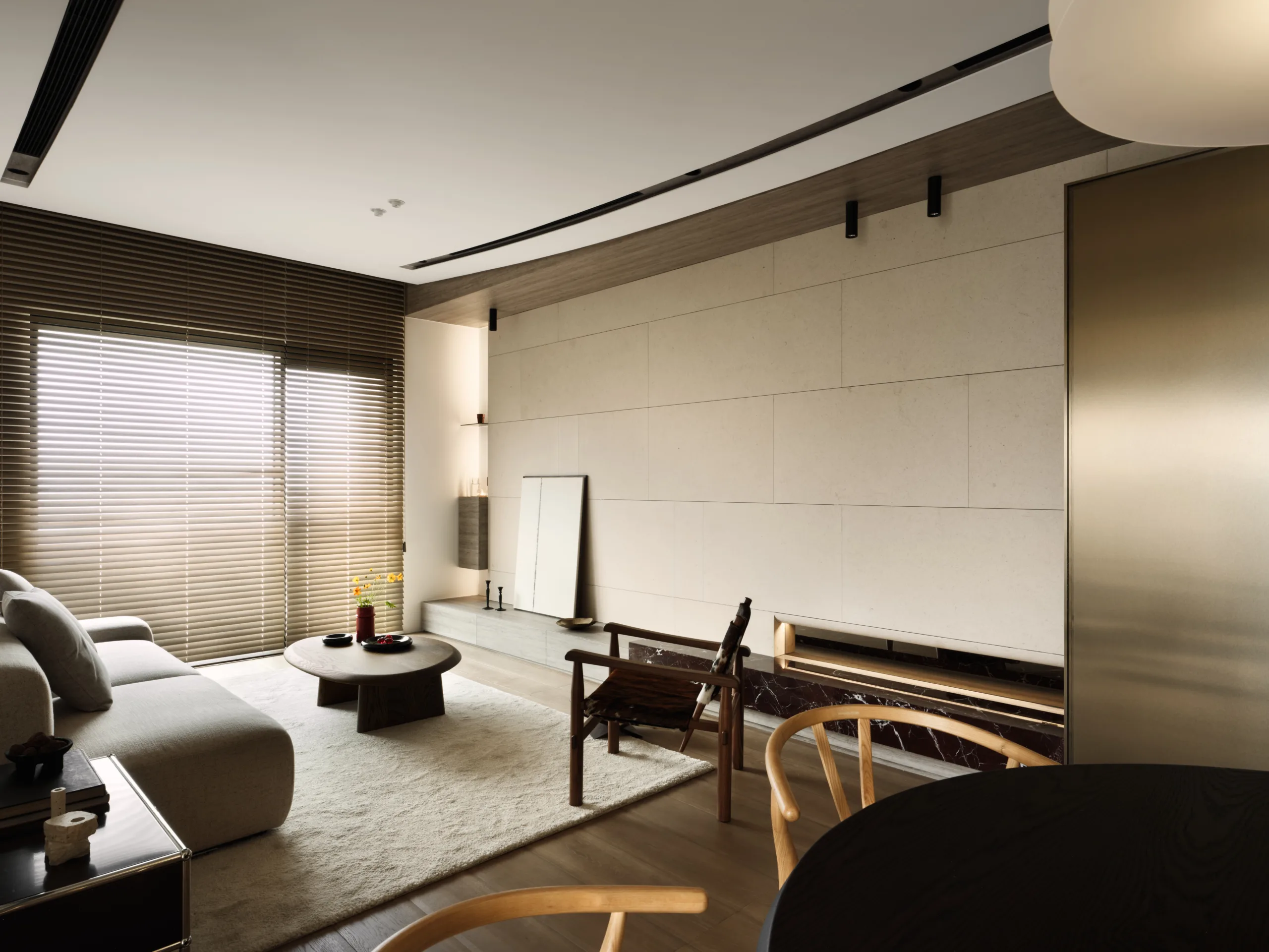 全室以大地色為基底,佐天然材質與光影堆疊層次;百葉隨日光轉動,靜靜鋪展日常氣息,在材光交織之間,凝鍊出一幅沉靜、柔韻且深具情感溫度的生活畫面。