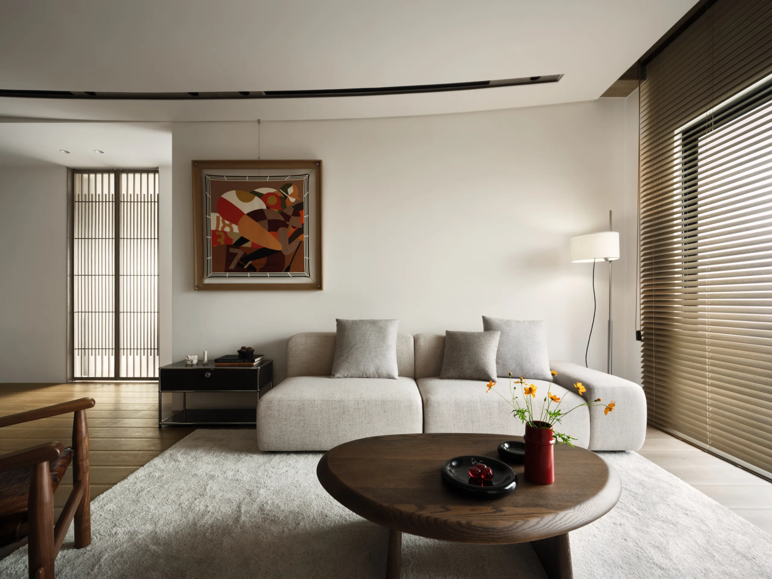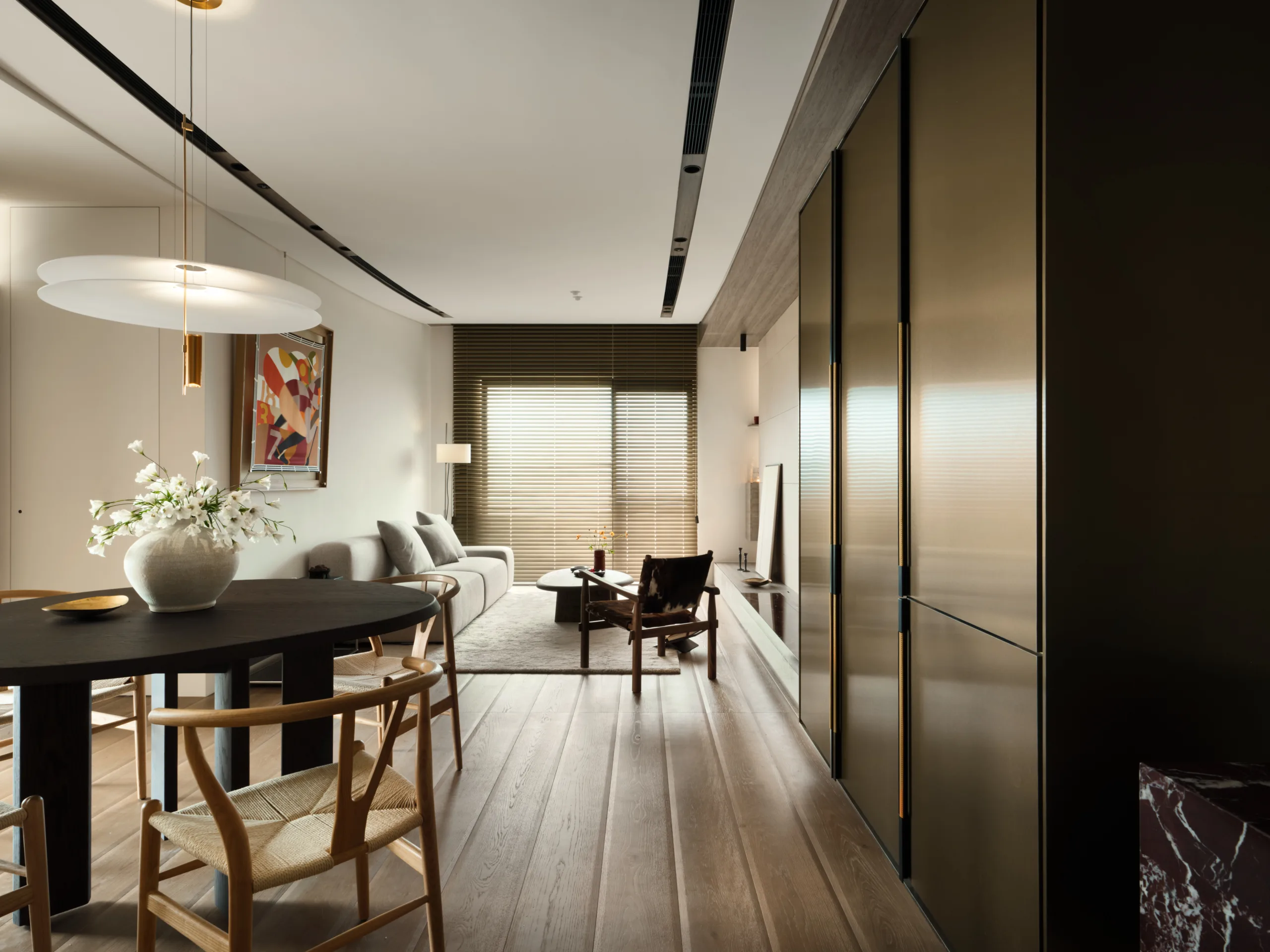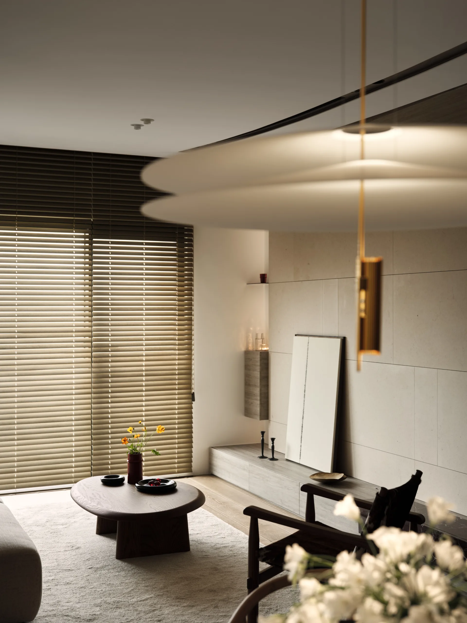 全室以大地色為基底,佐天然材質與光影堆疊層次;百葉隨日光轉動,靜靜鋪展日常氣息,在材光交織之間,凝鍊出一幅沉靜、柔韻且深具情感溫度的生活畫面。