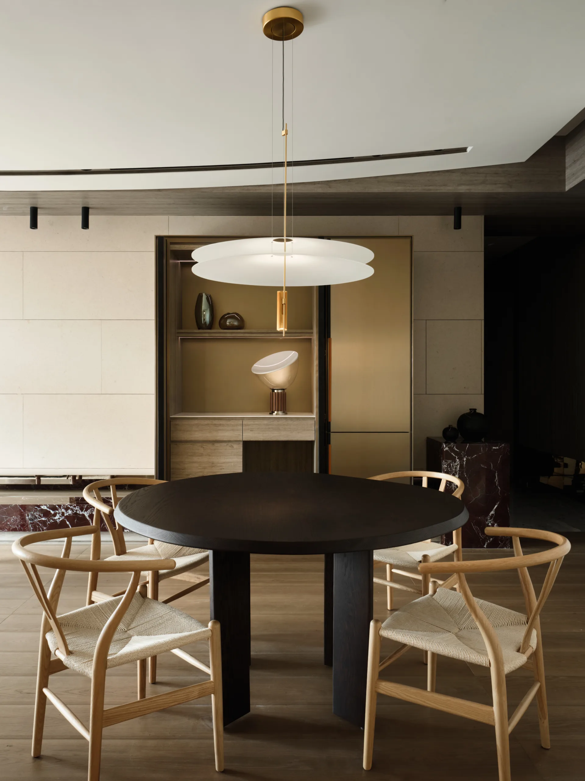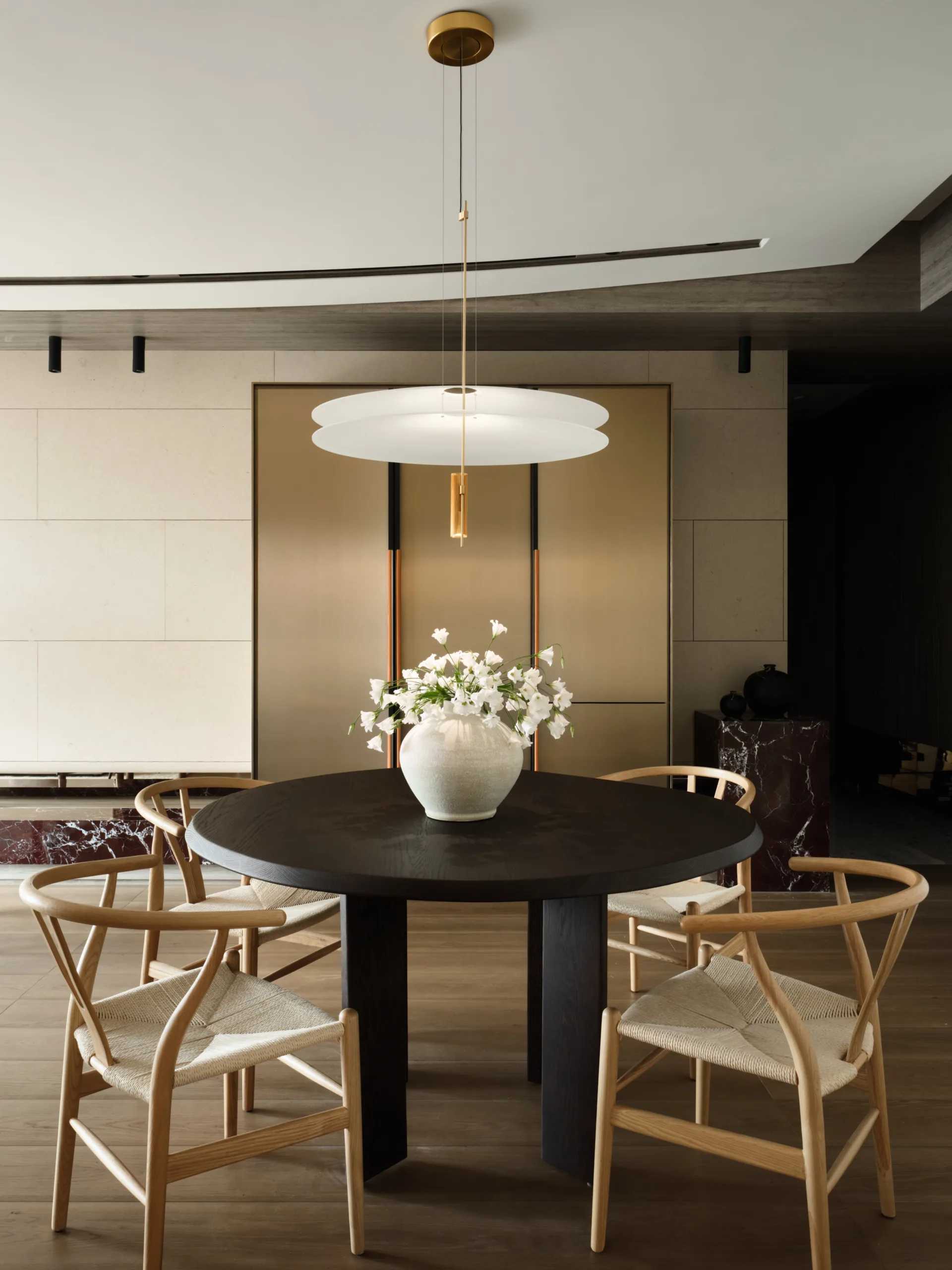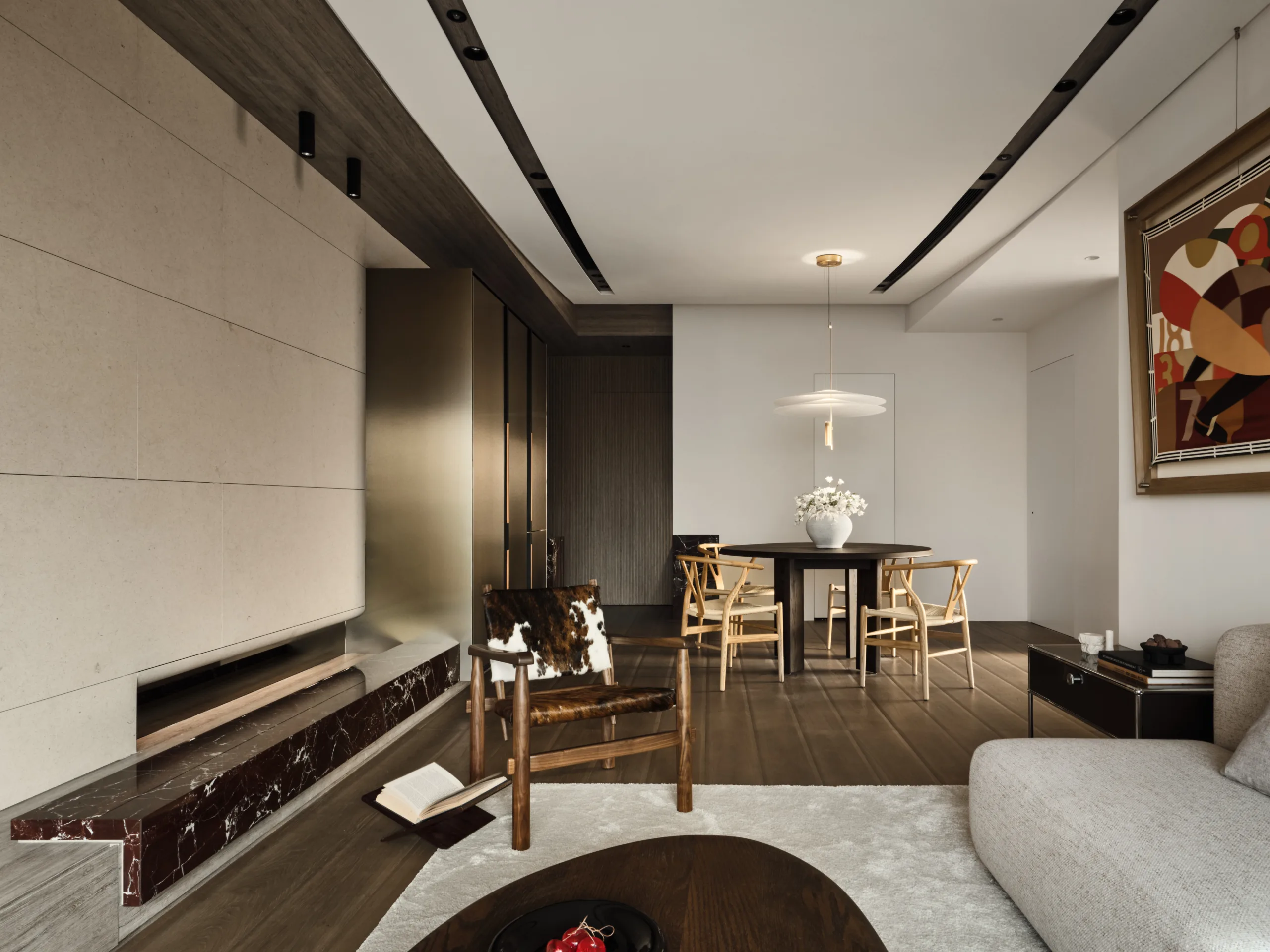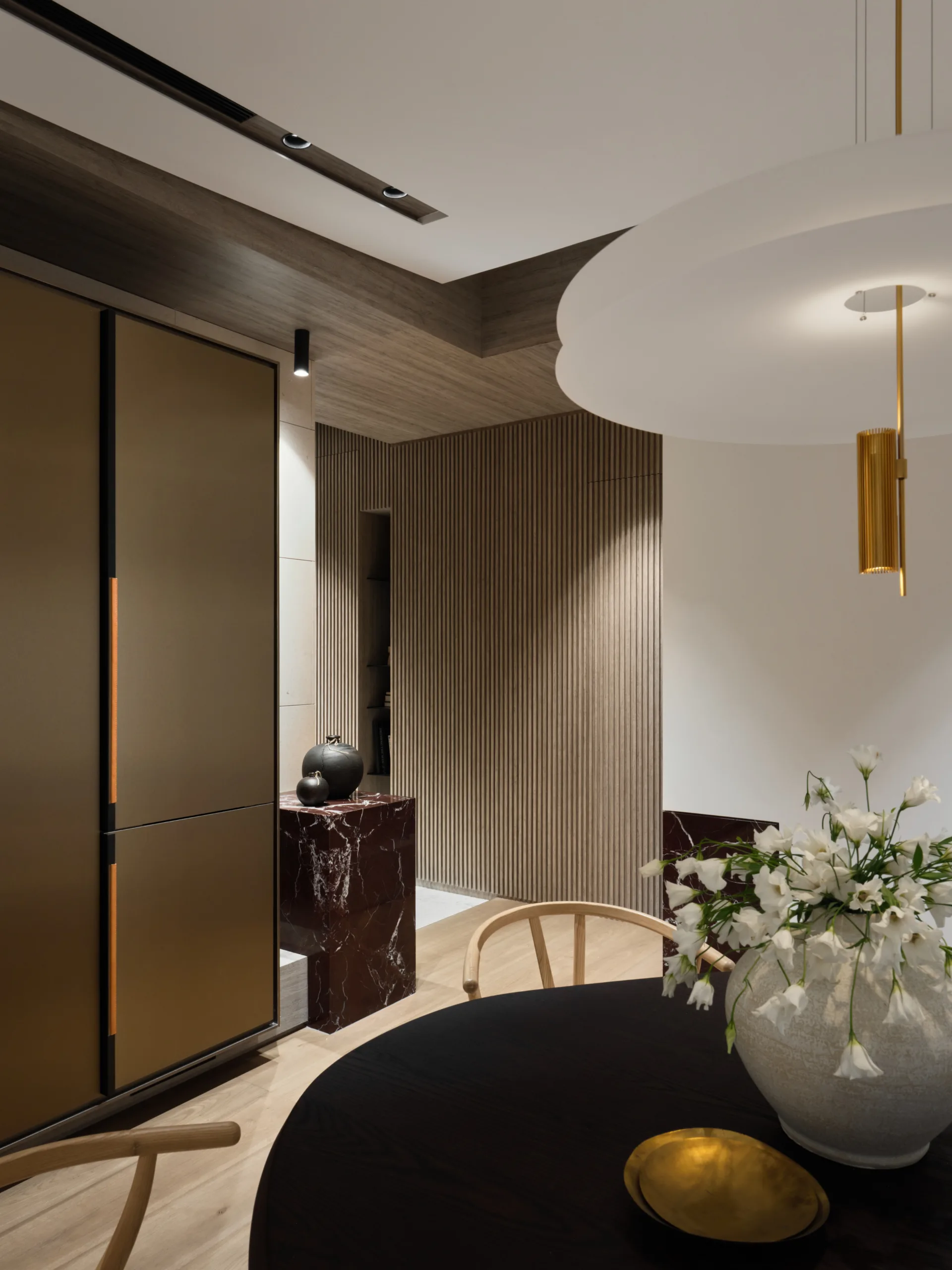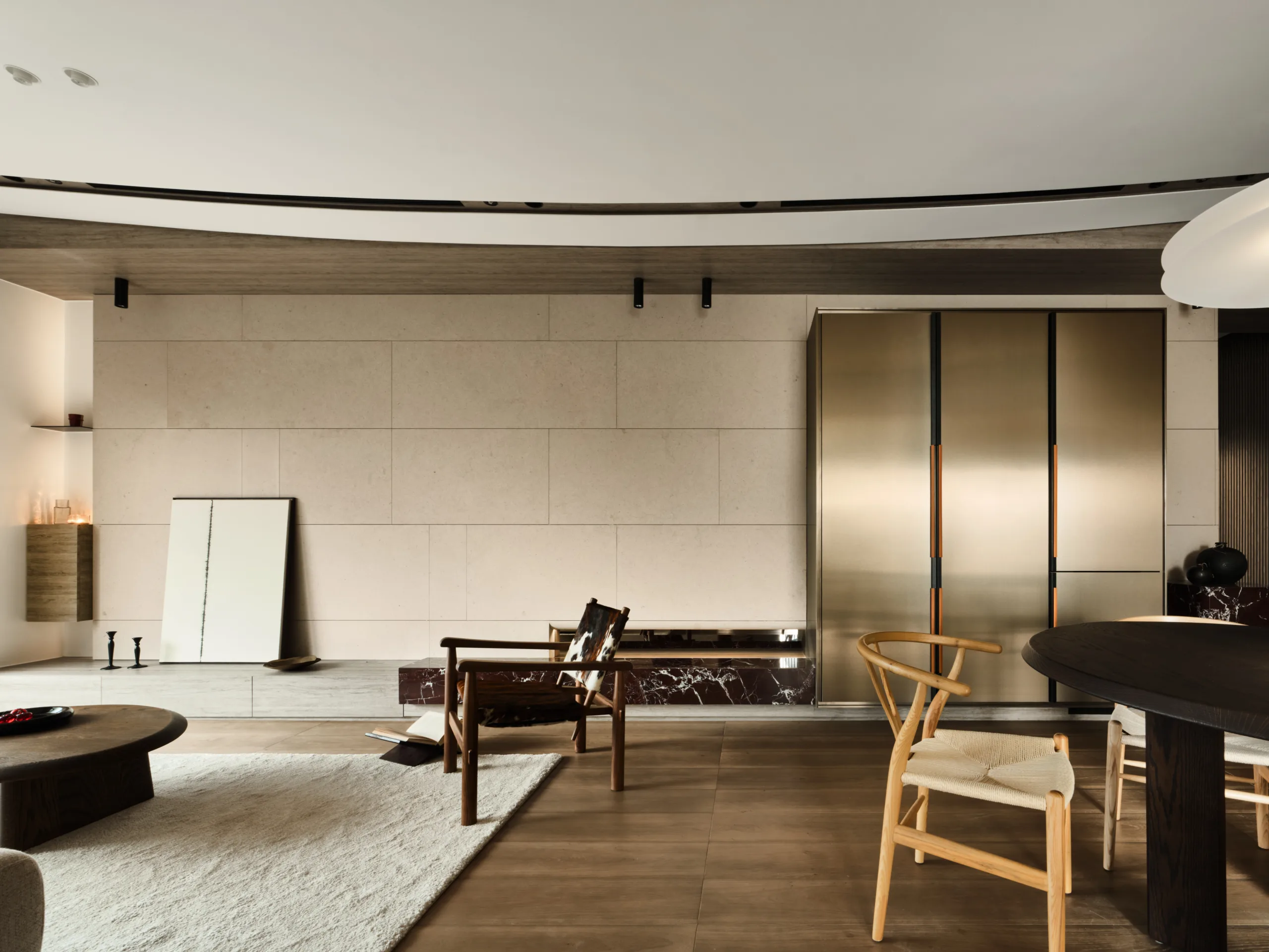 Delicate strokes shape this tranquil living space, where a sweeping arched ceiling flows like a ribbon of light, unifying the public areas in one graceful rhythm.